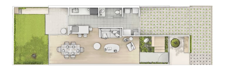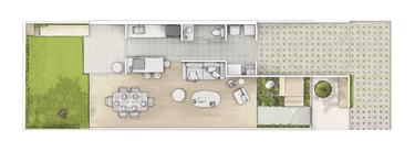 Planta baja, con un patio tipo japones al ingreso, sala comedor, cocina con isla, y patio posterior.