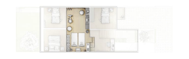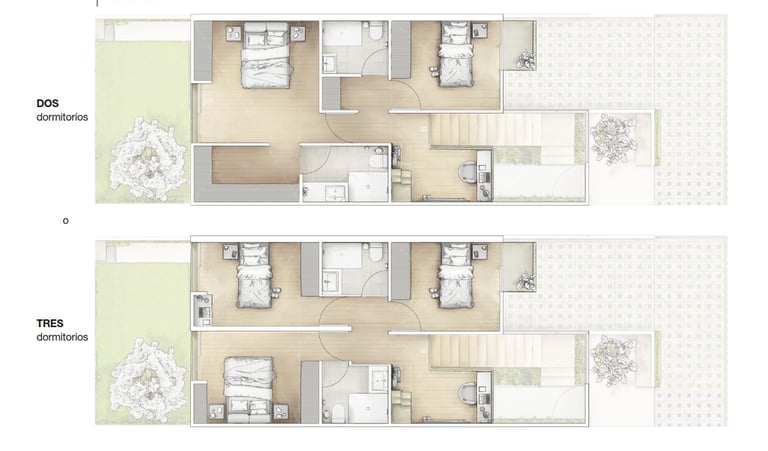 Planta alta, con dos o tres dormitorios, y una estación de trabajo o estudio.