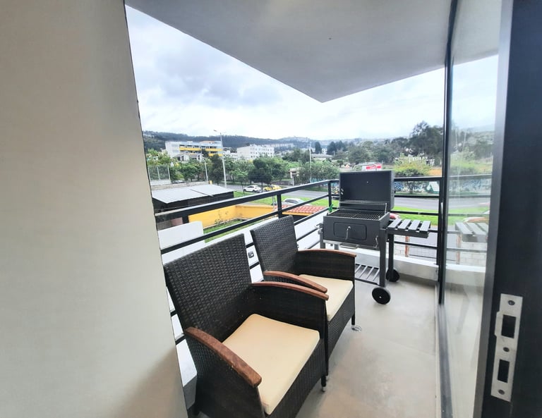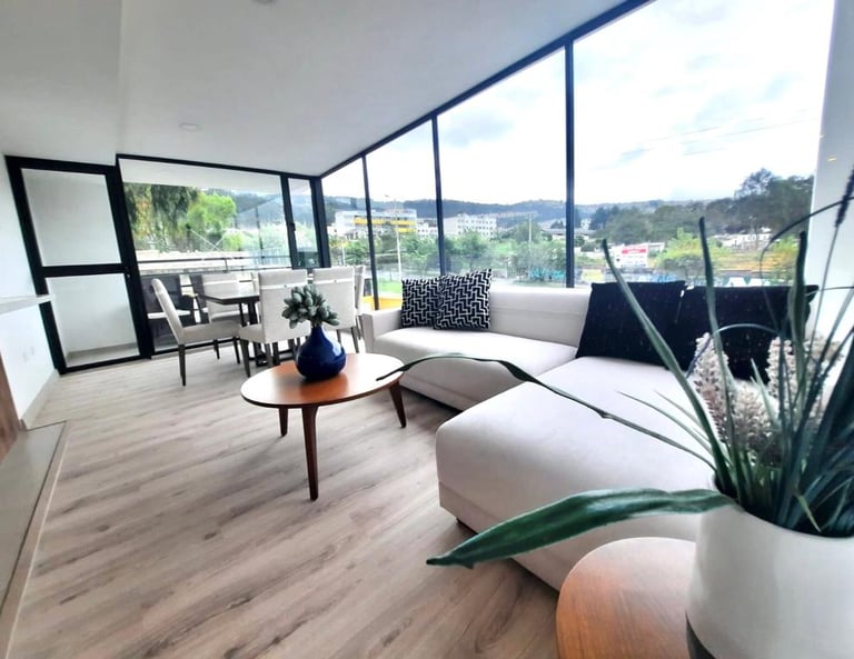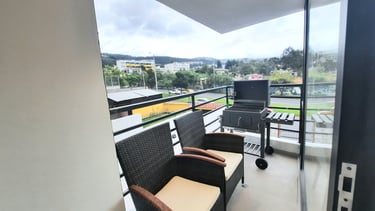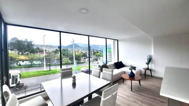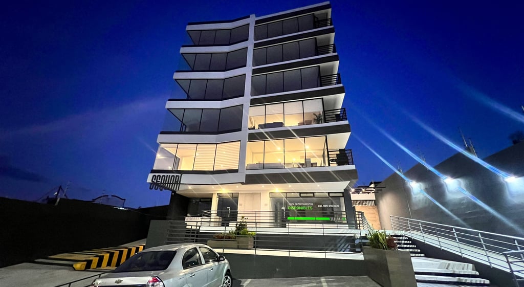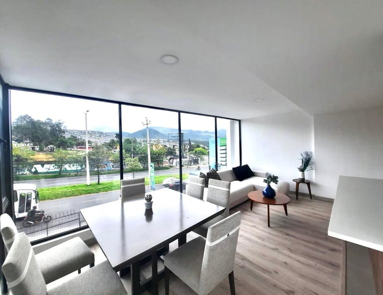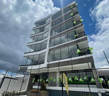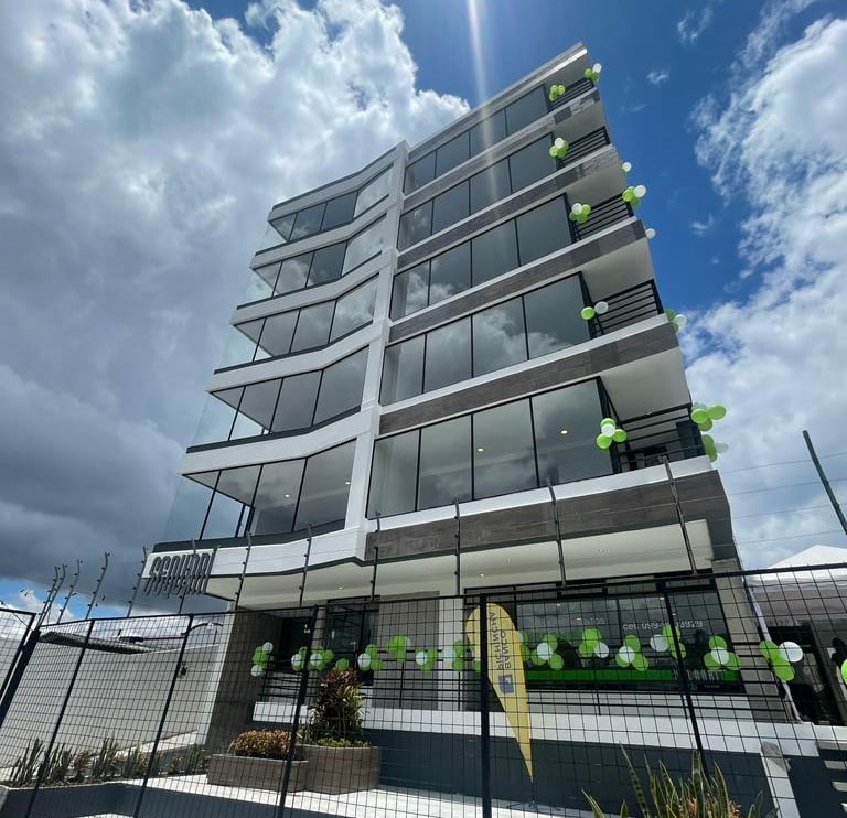 Este moderno edificio de departamentos se encuentra en la Av. Mariscal Sucre al norte de Quito, a pocos minutos del centro comercial El Condado, y cuenta con líneas de transporte que pasan por la vía aledaña.