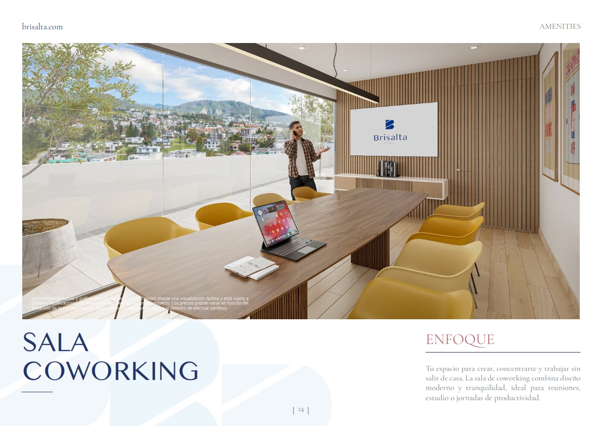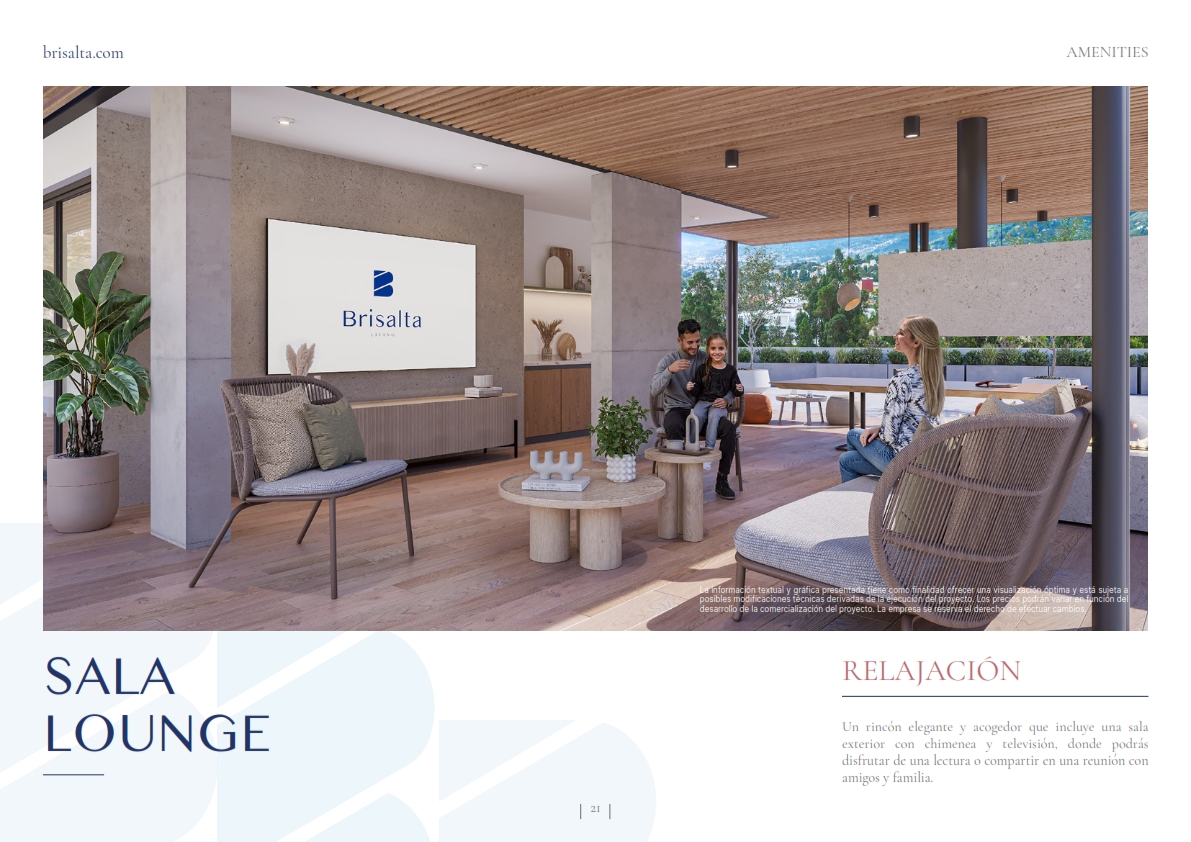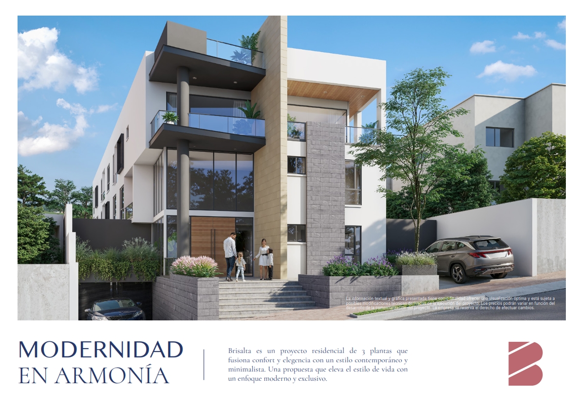 Brisalta es un proyecto residencial de 3 plantas que fusiona confort y elegancia con un estilo contemporáneo y minimalista. Una propuesta que eleva el estilo de vida con un enfoque moderno y exclusivo, en un entorno tranquilo rodeado de áreas verdes que permiten tener una conexión profunda con la naturaleza y disfrutar de aire puro, sin alejarse del área mas exclusiva y dinámica del centro de Cumbayá.